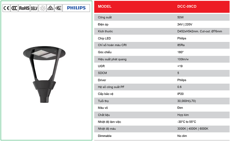 Cột đèn sân vườn DCC-09CD. Công suất: 50W. Điện áp: D452xH542mm. Cut-out: Ø76mm. Chip LED: Philips. CRI: 85Ra